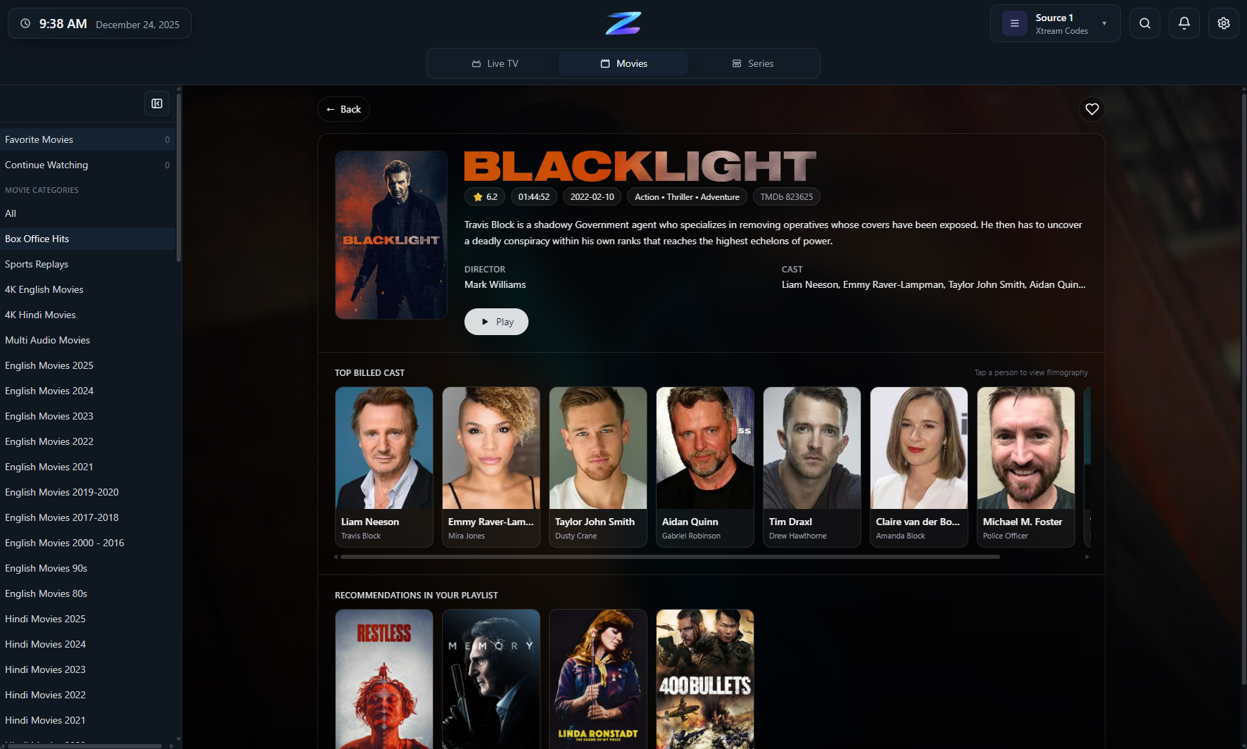 Browse categories, open details, and play instantly. Continue Watching for unfinished movies/episodes with progress tracking, plus playlist-scoped favorites for Movies and Series.
