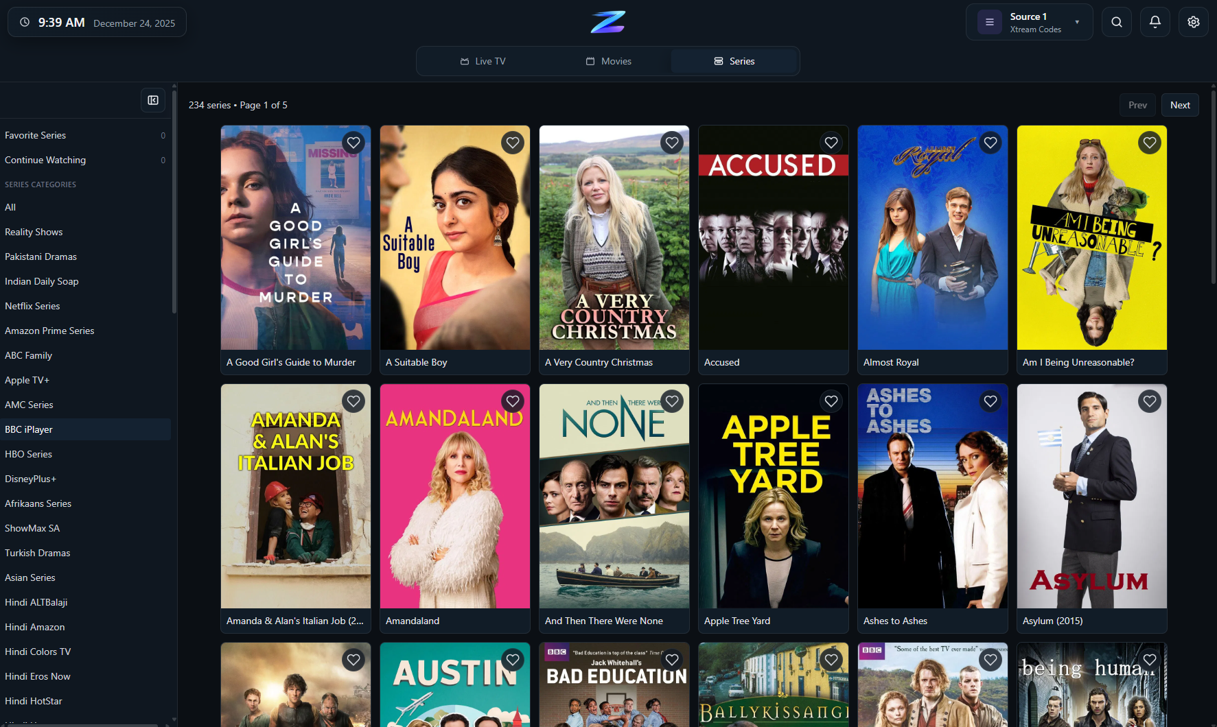 Favorites for Live TV channels (with optional reorder support), recently viewed channels, and fast search across Live TV, Movies, and Series.